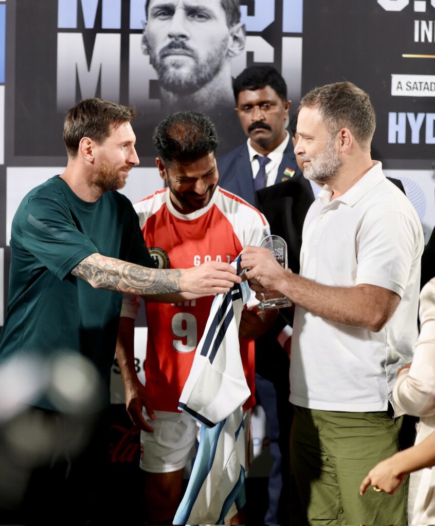 In a standout diplomatic moment, Messi engaged with Rahul Gandhi, Leader of the Opposition in India’s Lok Sabha, during the Hyderabad event. The football legend greeted Gandhi warmly, shared greetings, and presented him with a signed Messi No. 10 jersey, symbolising mutual respect and the unifying power of sport. The brief interaction captured wide media attention and was celebrated by fans on social media platforms.